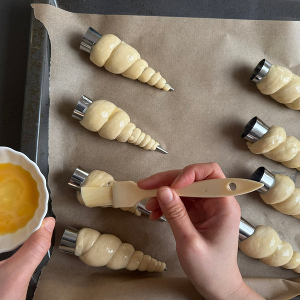 The unique spiral shape is achieved by wrapping dough around a conical mold before baking, creating a hollow space perfect for creamy fillings.