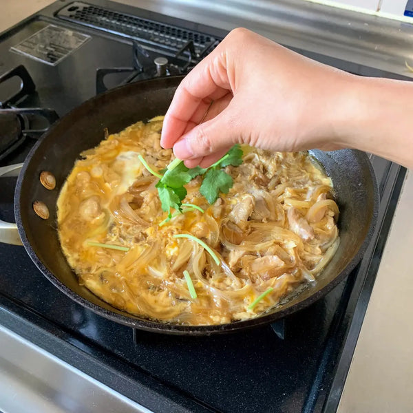 Let’s learn about the origins of oyakodon’s name. In Japanese, “oyako” means “parent and child” because it is made of chicken = parent and egg = child. Also, “don" comes from the word "donburi," which is a large, deep bowl.