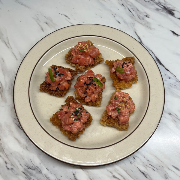 The spicy tuna topping is usually made with sashimi-grade raw tuna, Japanese mayo, sriracha, and a splash of soy sauce, but you can adjust it to taste with sesame oil, green onions, or jalapeño. For serving, top the crispy rice with avocado slices, sesame seeds, or a drizzle of unagi sauce for extra flavor.