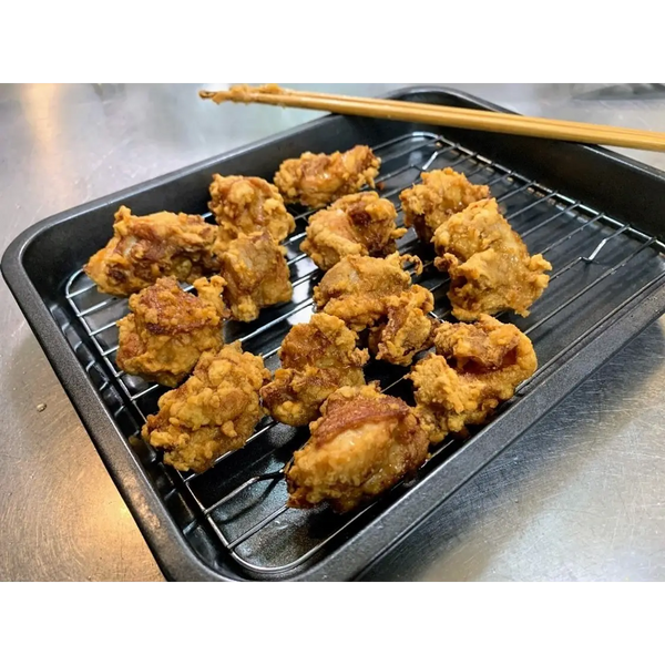 Karaage is a typical Japanese home-style deep-fried dish consisting of chicken thighs seasoned with soy sauce, garlic, and other seasonings. They are then coated with flour or starch and deep-fried in hot oil. Once fried, the chicken's coating becomes crisp to perfection, while the meat remains tender and juicy.