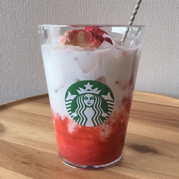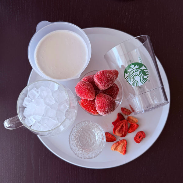 Starbucks uses freeze-dried strawberry slices on top, so I chose freeze-dried ones. If you like, Muji’s chocolate-covered freeze-dried strawberries also work well in this drink. If you have freeze-dried strawberries on hand, I recommend using it, but you can use fresh or dried strawberries for the toppings as well.
