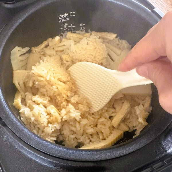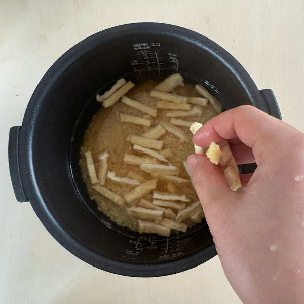 - Do not mix toppings before cooking: Place bamboo shoots and aburaage on top of the rice so they steam gently while the rice cooks.
